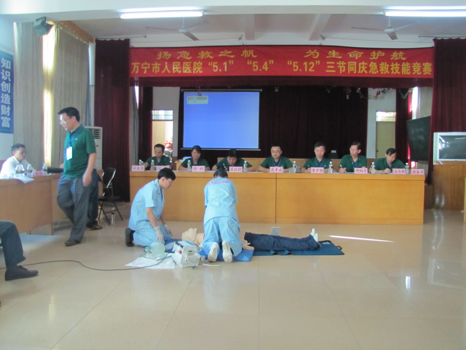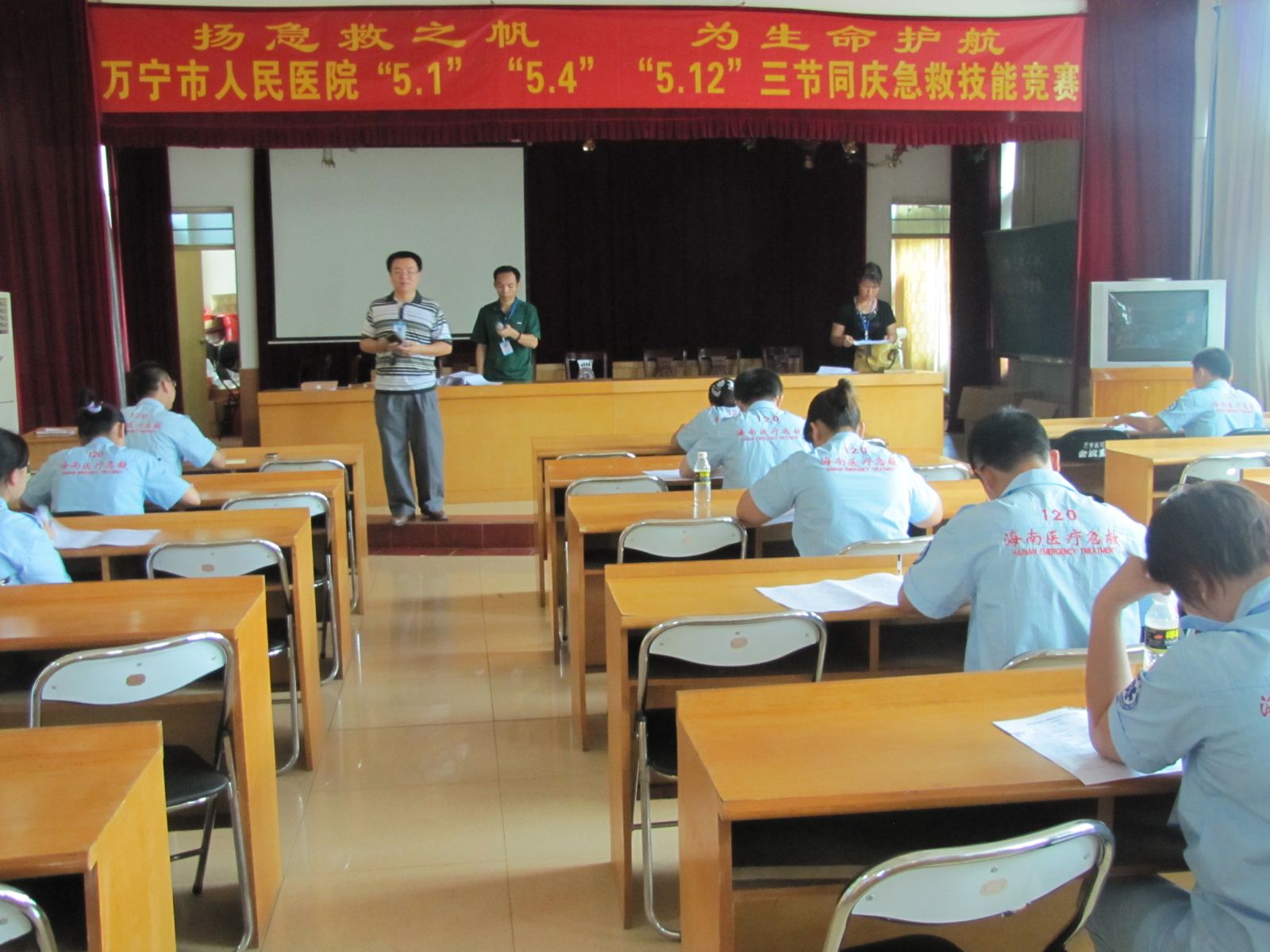 为迎接“5.1”国际劳动节、“5.4”青年节、“5.12”国际护士节,加强我院医疗急救工作,增强急救人员急救意识,提高医疗急救救治水平,提升服务质量,维护人民群众生命健康安全。医院决定举办主题为“扬急救之帆,为生命护航”的急救技能竞赛活动。今天上午(2012年5月8日)竞赛活动在医院学术厅全面展开,首先进行的是基础理论知识竞赛,各科室派出参加竞赛的医务人员共30多名进行了理论考核,下午,医疗组的技能操作也在学术厅拉开了序幕。(图、文:院办)