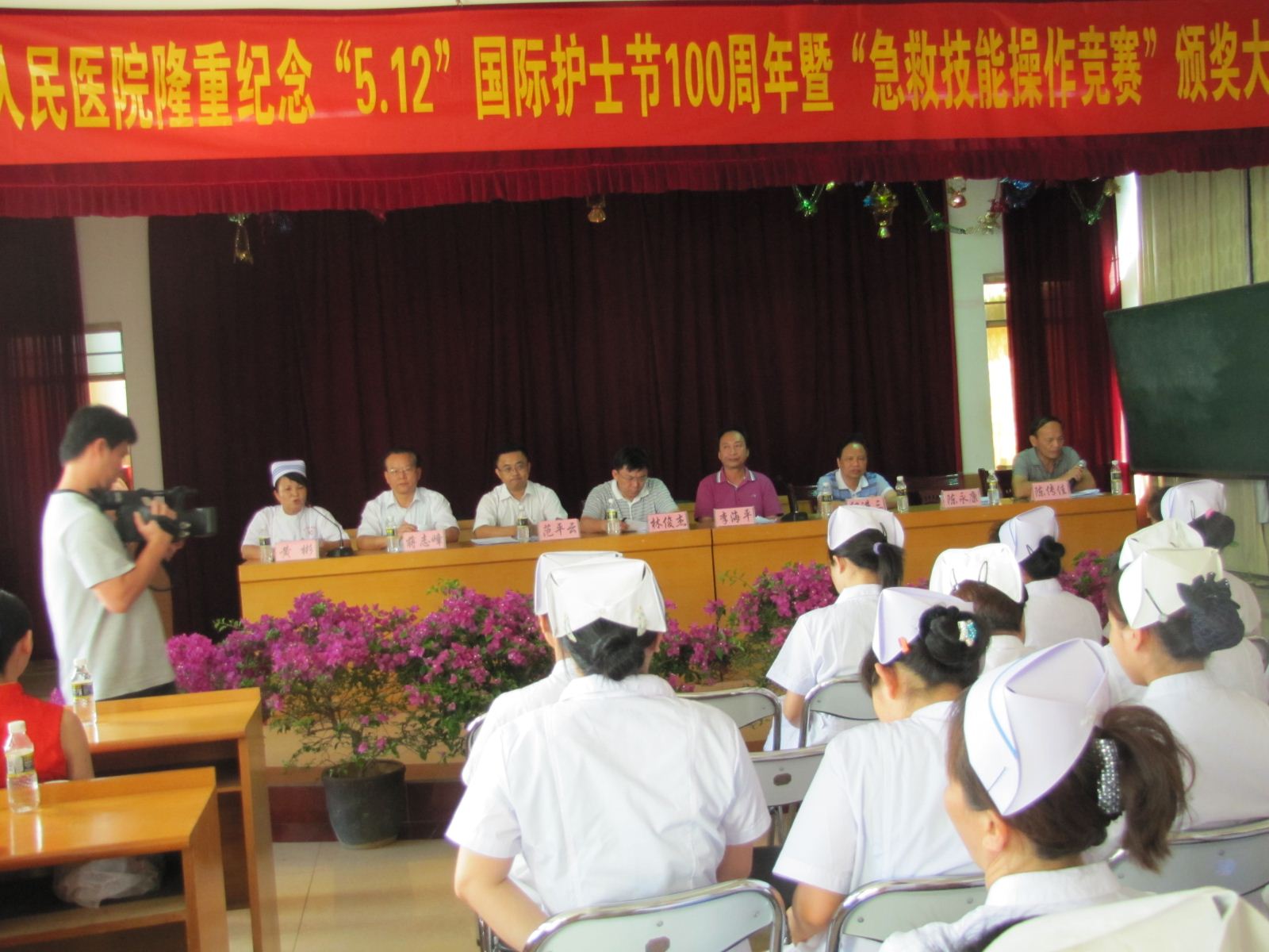 万宁市人民医院为了隆重纪念“5.12”国际护士节100周年,医院组织2011年度“优秀护士”评选和大规模的“急救技能竞赛活动”,急救技能竞赛经过经过5月8-9连续两天紧张激烈的比赛,全部优胜者已全部产生。5月11是下午,医院在院学术厅组织召开了全院职工参加的颁奖大会,市卫生局李海平局长和医政股纪进三股长前来参加了会议并进行了颁奖。本次大会共对18名优秀护士、3名30年护龄护士及“急救技能竞赛”活动的护士组个人单项、个人全能;医生组个人单项和个人全能及团体获奖科室进行了颁奖。颁奖大会在欢乐的乐曲和热烈的氛围中顺利进行,并圆满地落下了帷幕。(图、文:医务科)