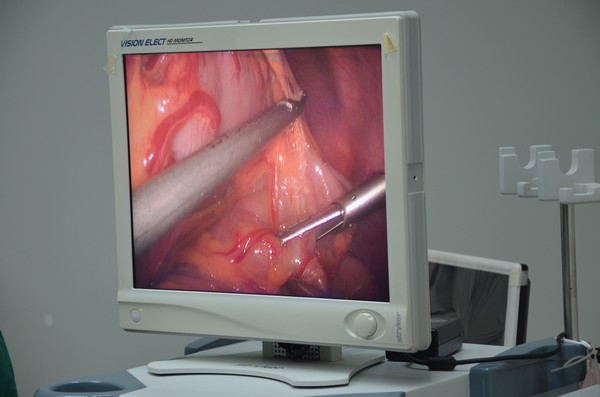医生通过监视器屏幕上所显示患者器官不同角度的图像,对病人的病情进行分析判断,并且运用特殊的腹腔镜器械进行手术。