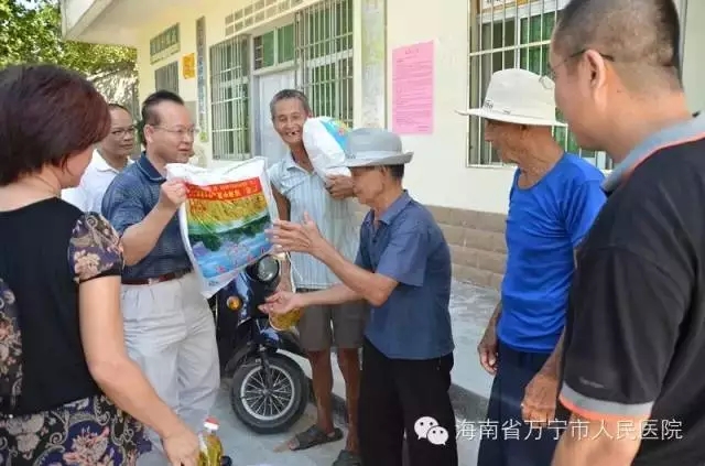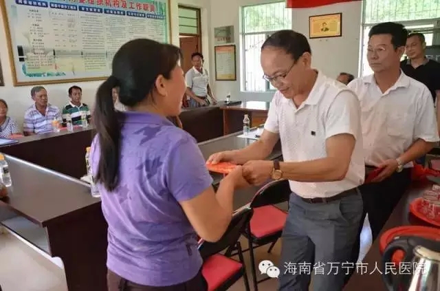 2015年 6月30日上午9时,在“七一”建党节来临之际,万宁市人民医院郑武平院长、陈传佳副书记一行到对口帮扶的后安镇六合村和白石村,登门看望慰问老党员,帮助他们解决实际困难,为他们送去慰问品和慰问金,为他们带去党和政府的亲切关怀,送上节日的美好祝福。
