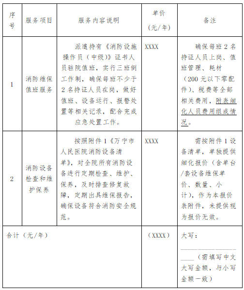 2.细化后的消防设备维保报价、人员费用组成需按附件1设备清单逐一列明,明确单台/套设备维保单价、数量、小计及合计金额,与本报价表一并提交;